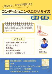 column コラム HOMEコラムお知らせ[NEW レッスンのご紹介] 2026.04.03 お知らせ [NEW レッスンのご紹介] 5月より「足首」と「足裏」に特化したエクササイズを行います。 〜このような要望がある方にオススメ〜 ・足首の柔軟性を上げたい。 ・立ち方を綺麗にしたい。 ・スポーツパフォーマンスを向上させたい。 ・つまずきにくい身体を作りたい。 •ボディメイク•コンディショニングの動きを向上させたい。 などなど 足裏は建物で例えると「柱」に値する部分になります。 そのため足部を整えることは健康的な生活を送るために必要であります。 皆さまからの参加のご連絡お待ちしております。 前の記事へ 記事一覧